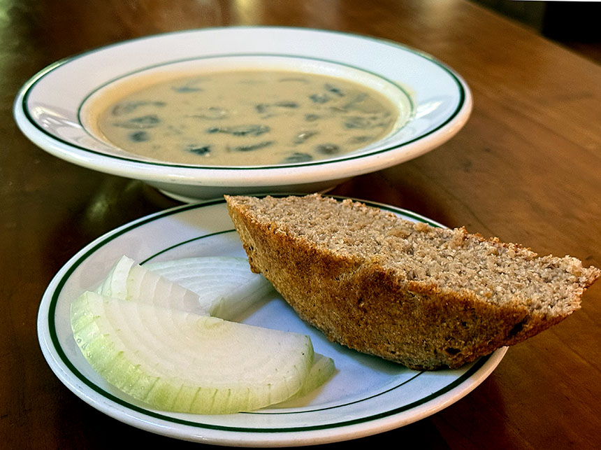 Cream of mushroom soup and whole wheat bread. Click here for high-resolution version.