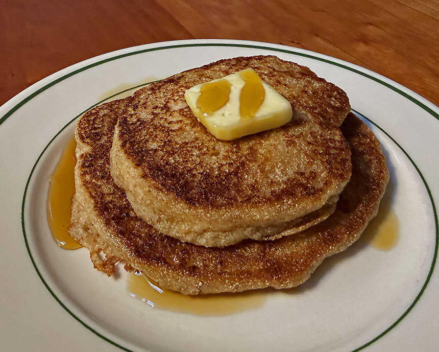 The pancakes in the photo are made from fresh-ground barley flour, a little olive oil, a little baking powder, and nonfat milk.
