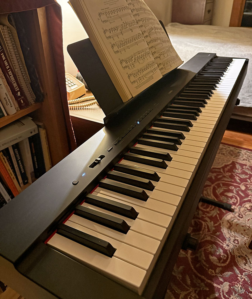 Though in my younger days I had a piano for many years, it had been 20 years since I owned a piano. A rather large organ console now occupies all the musical space downstairs (not to mention the ten speaker cabinets upstairs). To have a real piano again was out of the question for lack of space. But I finally acquired the next best thing to a real piano — a pretty good digital piano. I put it in my bedroom, the warmest and best-lit part of the house during the winter because of the big gothic windows.
