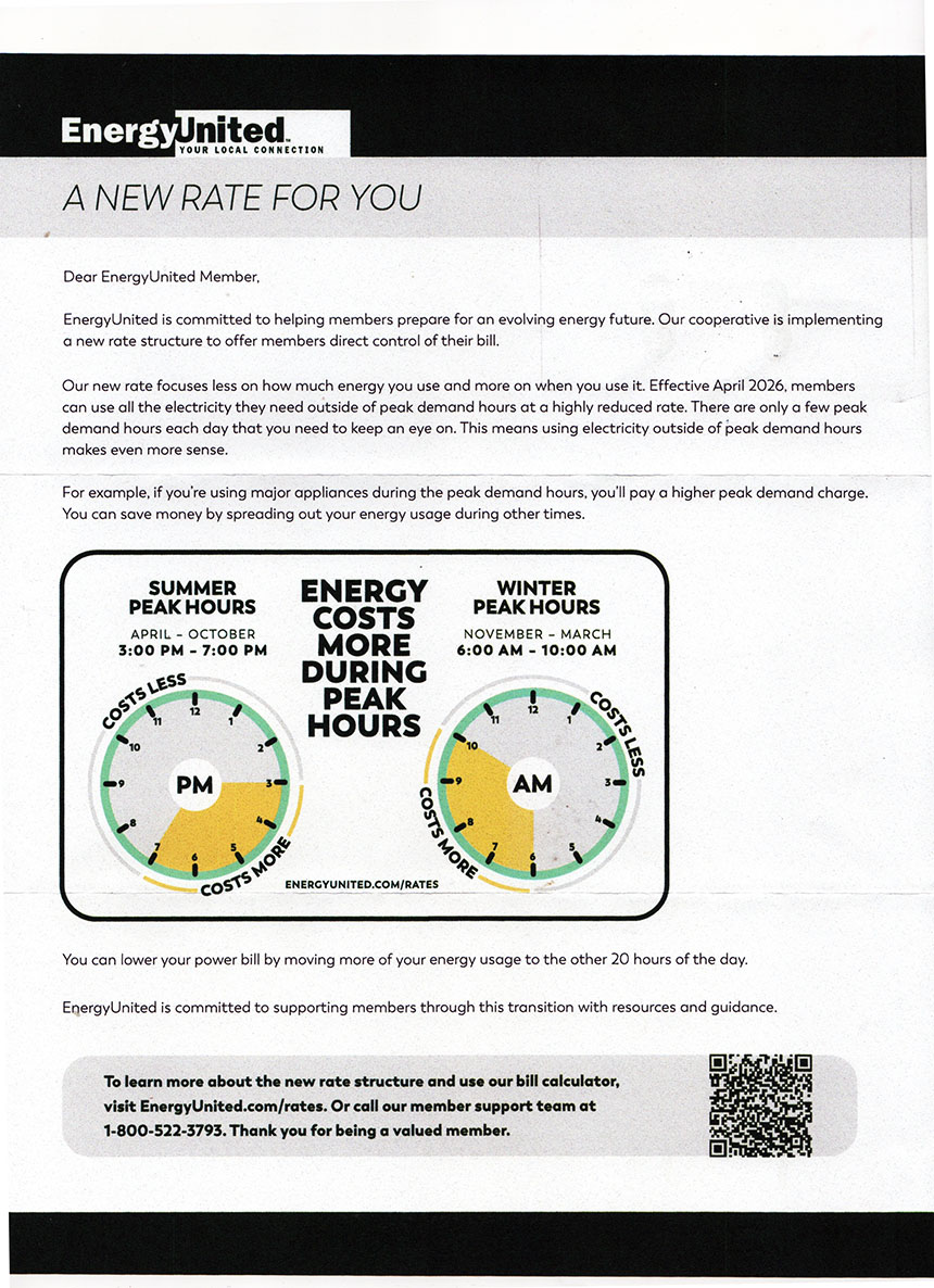 My electric company, Energy United, is a small regional co-op. I tend to trust them more than I would ever trust the energy giant in this part of the country, Duke Energy. Still, a co-op that doesn’t generate any power itself must buy it, and I assume that Energy United buys primarily from Duke Energy. I assume that Duke Energy charges Energy United more for electricity during peak demand times.