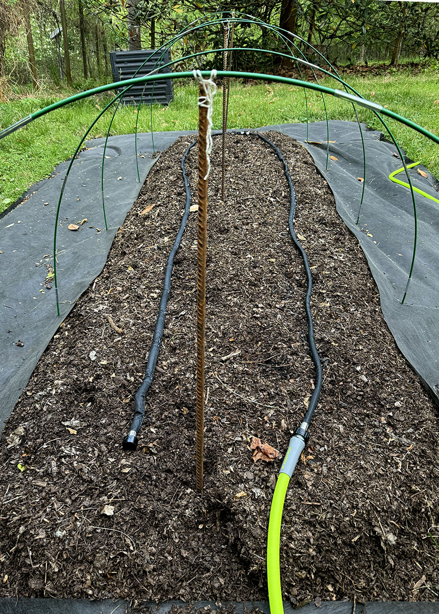 ⬆︎ The leek bed, with a drip hose. I’ve made a longer, narrower row with room for six tomato plants, four cucumber plants, and some basil. Click here for high-resolution version.