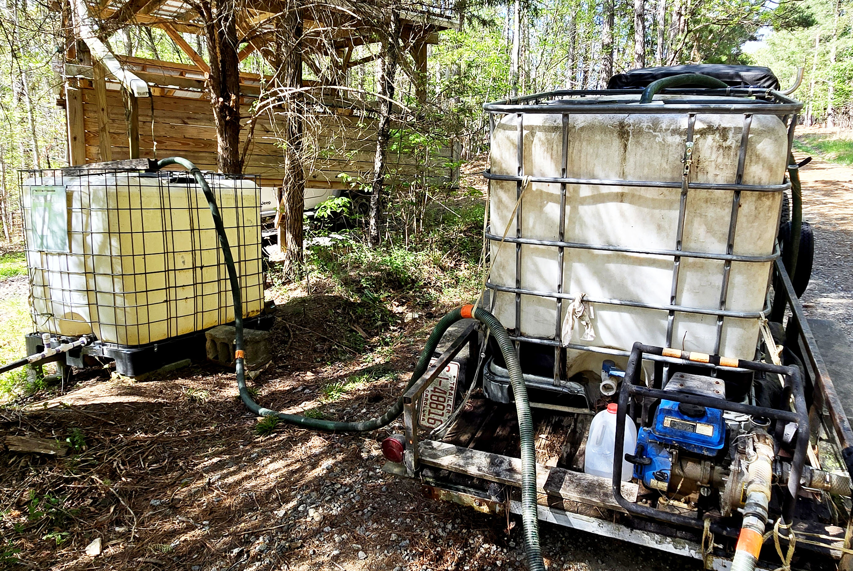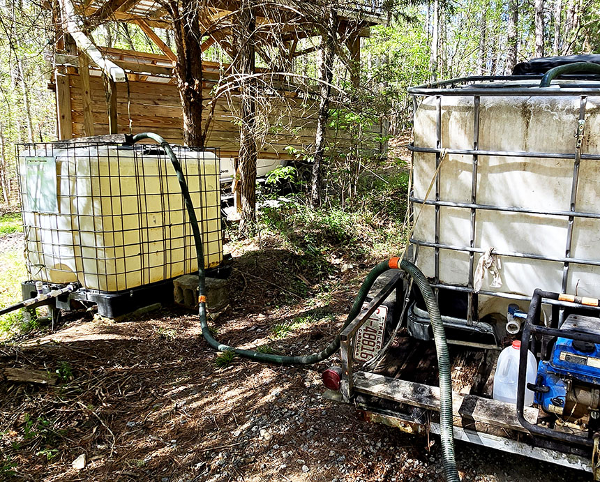 I’ve had a rain tank that Ken set up several years ago. When there’s rain, the roof of the shed catches it and spouts it into the rain tank. The tank is up the hill from the garden. A buried pipe carries water downhill to the garden. When there’s no rain, my nearest neighbor brings out his water wagon. He pulls it with his Jeep or with a tractor. There’s a gasoline-powered water pump on the back. Just down the road in the woods in a small stream that is always flowing. So water is always be available for the neighbors’ garden and for mine without having to use well water.