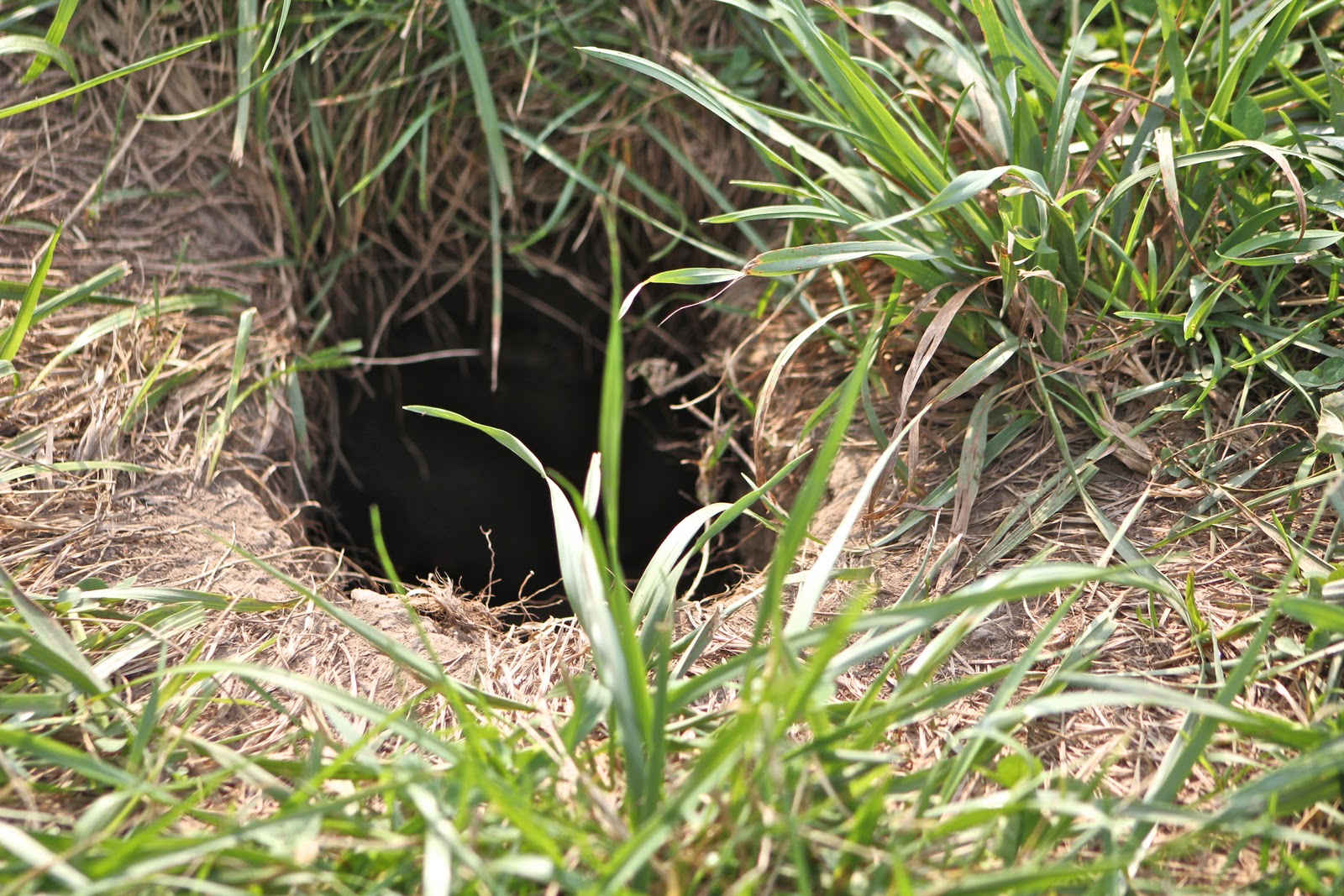 Whoever made the hole is very tidy. The landing is very neat, and they’ve spread dry glass on the floor into the burrow.